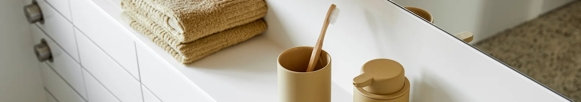 For et ensartet look på dit badeværelse, hvorfor ikke matche din tandbørstekop med dine andre badeværelsestilbehør såsom sæbedispensere, toiletrulleholdere eller pedalspande.