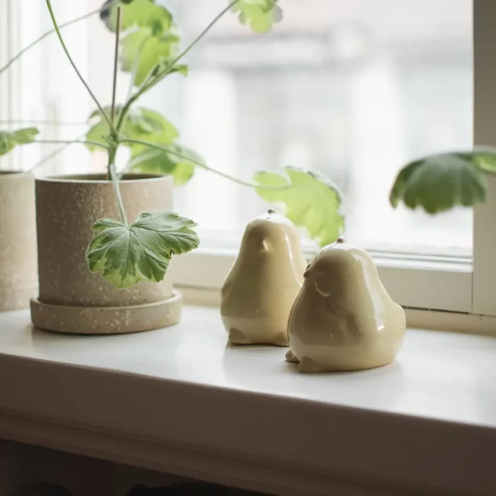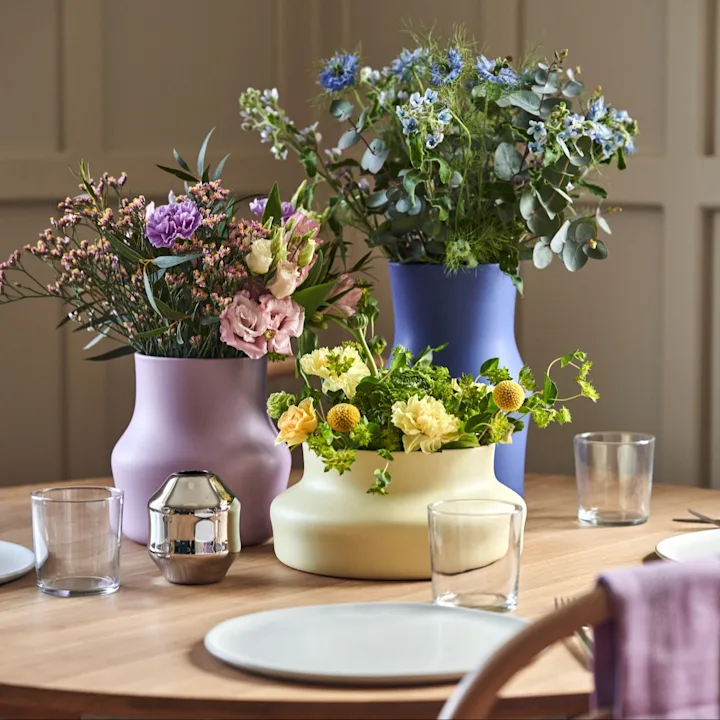 Indretningstips og de nyeste indretningstrends at læse om hos Nordic Nest. Her en gul vase fra Marimekko med orange tulipaner i.