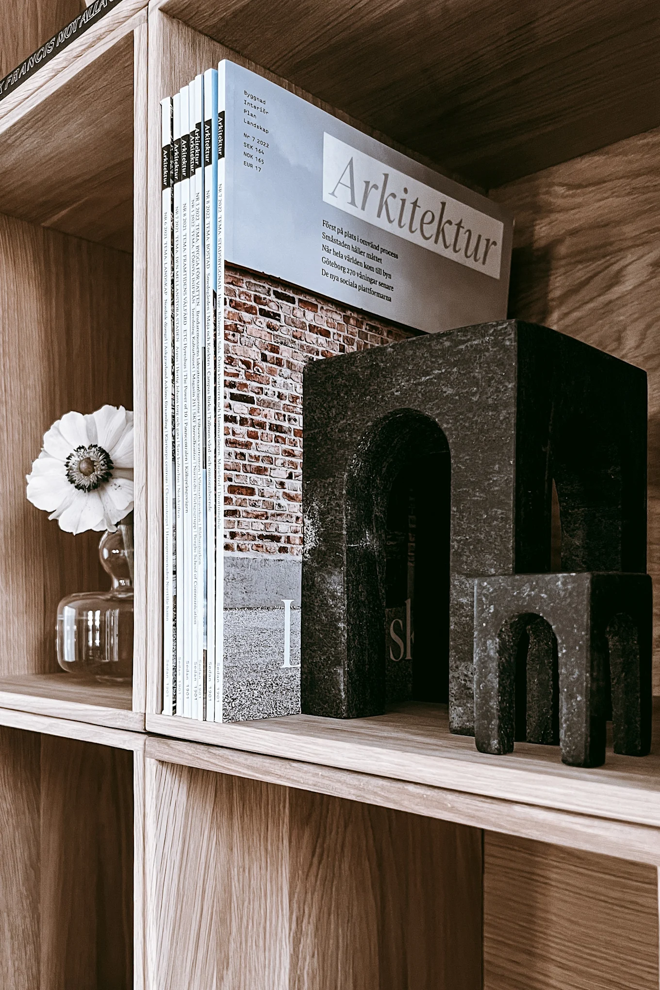 - "Måske kan du sætte en afskåret blomst i en glasvase og tage en farve eller nuance fra en af dekorationerne. På den måde kan du skabe en rød tråd i hele hyldens indretning. Men du kan også slå på stortromme med en smuk buket eller en potteplante, der har velformede blade eller en interessant vækstform, som giver hylden et mere personligt og levende udtryk," siger Anela.