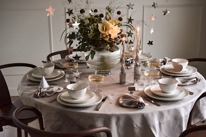 Hvis der er noget tidspunkt på året hvor man virkelig kan sætte alle sejl til, så er det nytår. Temaet er op til dig, hold det enkelt med hvidt service med guldaccenter. Hvis du vil have noget mere overdådigt, kan du tilføje legende elementer som fjer, stjerner og glitter. Eller måske en nytårsfestidé i sølv i stedet? Vælg en borddækning i forskellige grå toner for at få en ophøjet feststemning!