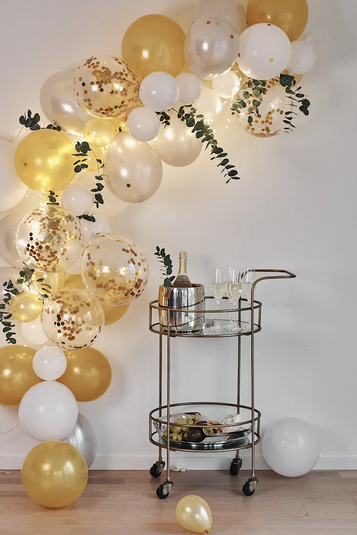 Hold farveskemaet enkelt med hvide og gennemsigtige balloner fyldt med konfetti, og tilføj et strejf af guld eller bronze for at bevare en elegant, men glamourøs festfølelse.