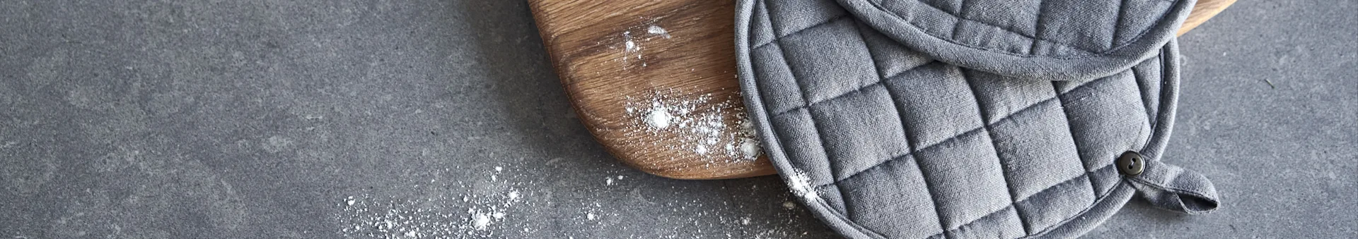 Grydelapper og grillhandsker er vigtige hjælpemidler i køkkenet, når du skal tage friskbagte boller ud af ovnen eller hælde kartoffelvandet fra gryden. De beskytter dine hænder mod varme stænk og er også praktiske som underlag.