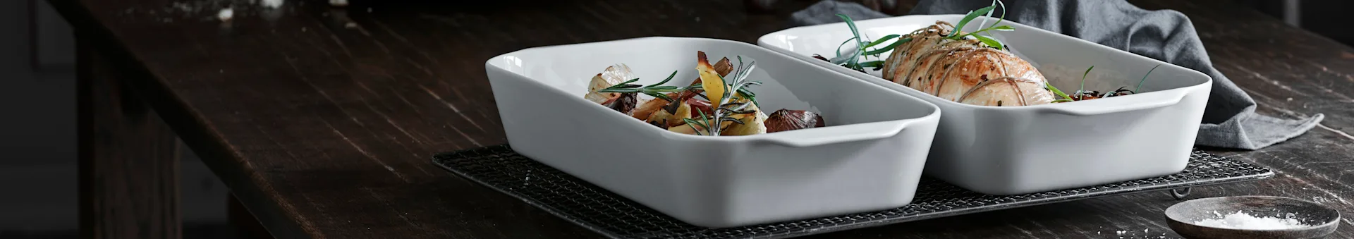 Her kan du finde et udvalg af store og små ovnfaste fade i en række former fra runde individuelle ovnfaste fade til store rektangulære bageplader.