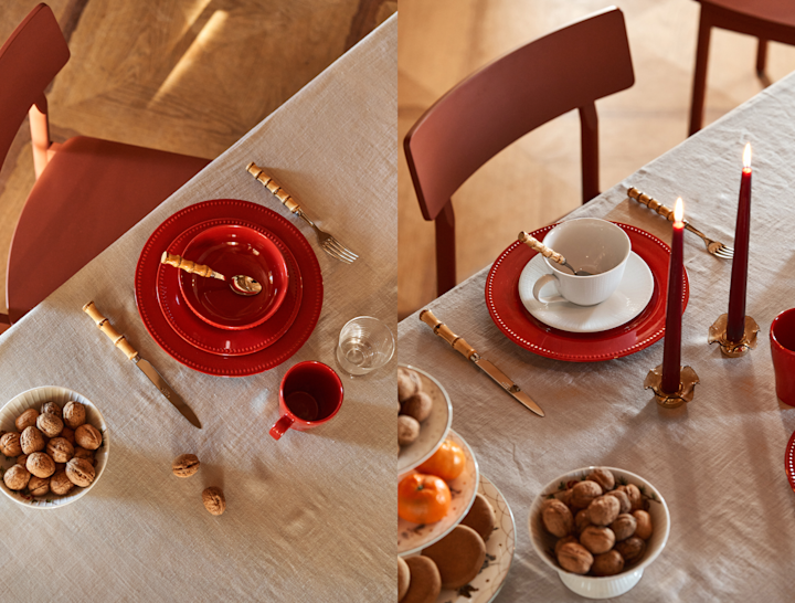 En rød juleskål er måske ikke den mest almindelige detalje på julebordet, selvom farven i sig selv antyder julens traditionelle toner. En fin og enkel måde at tilføje lidt ekstra farve til julebordet er dog med en rød juleskål. Det kan også være et banebrydende og spændende koncept at gå væk fra den traditionelle dækning ved at bruge rødt porcelæn og røde dekorationer på bordet, i stedet for en rød dug med en neutral service. Brug i stedet en neutral base, i en hvid eller grå nuance, for derefter at tilføje det røde som en accentfarve på julebordet, for en moderne drejning på juledækningen. Hos os finder du røde juleskåle fra kendte mærker som Höganäs Keramik, Iittala og Rörstrand .