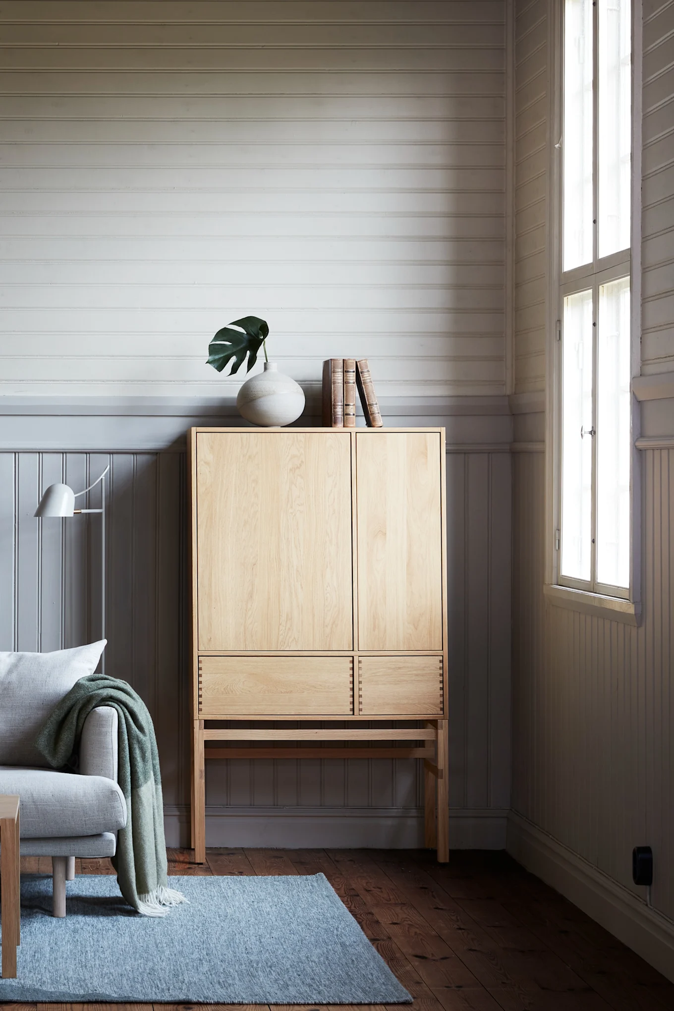 Møbler og interiørdetaljer er lavet af materialer af høj kvalitet, naturlige materialer, med træ som det primære materiale, suppleret med linned, bomuld, uld, metal og naturlig sten.