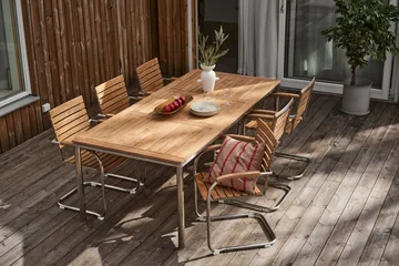 Rörvik spisebord fra svenske 1898 er et havebord i teak og rustfrit stål med plads til venner og familie. Bordets ribbede bordplade fremhæver træets struktur endnu mere, hvilket skaber et varmt og hjemligt udtryk. Det ubehandlede teak er vedligeholdelsesfri og vil over tid få en smuk patina. Skab vidunderlige minder på terrassen under dovne feriedage og søde sommeraftener.