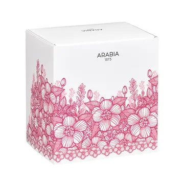 Huvila vase fra Arabia bliver med sit smukke blomsterdesign en fin detalje på bordet. Mønsteret er skabt af den finske designer og keramiker Heini Riitahuhta. Inspirationen kommer fra hendes barndomsminder om sin bedstemors hus og den atmosfære, der var der. Den rosa farve i mønsteret med vilde roser er også bedstemoderens yndlingsfarve. Resultatet er et romantisk blomsterpattern i moderne fortolkning.