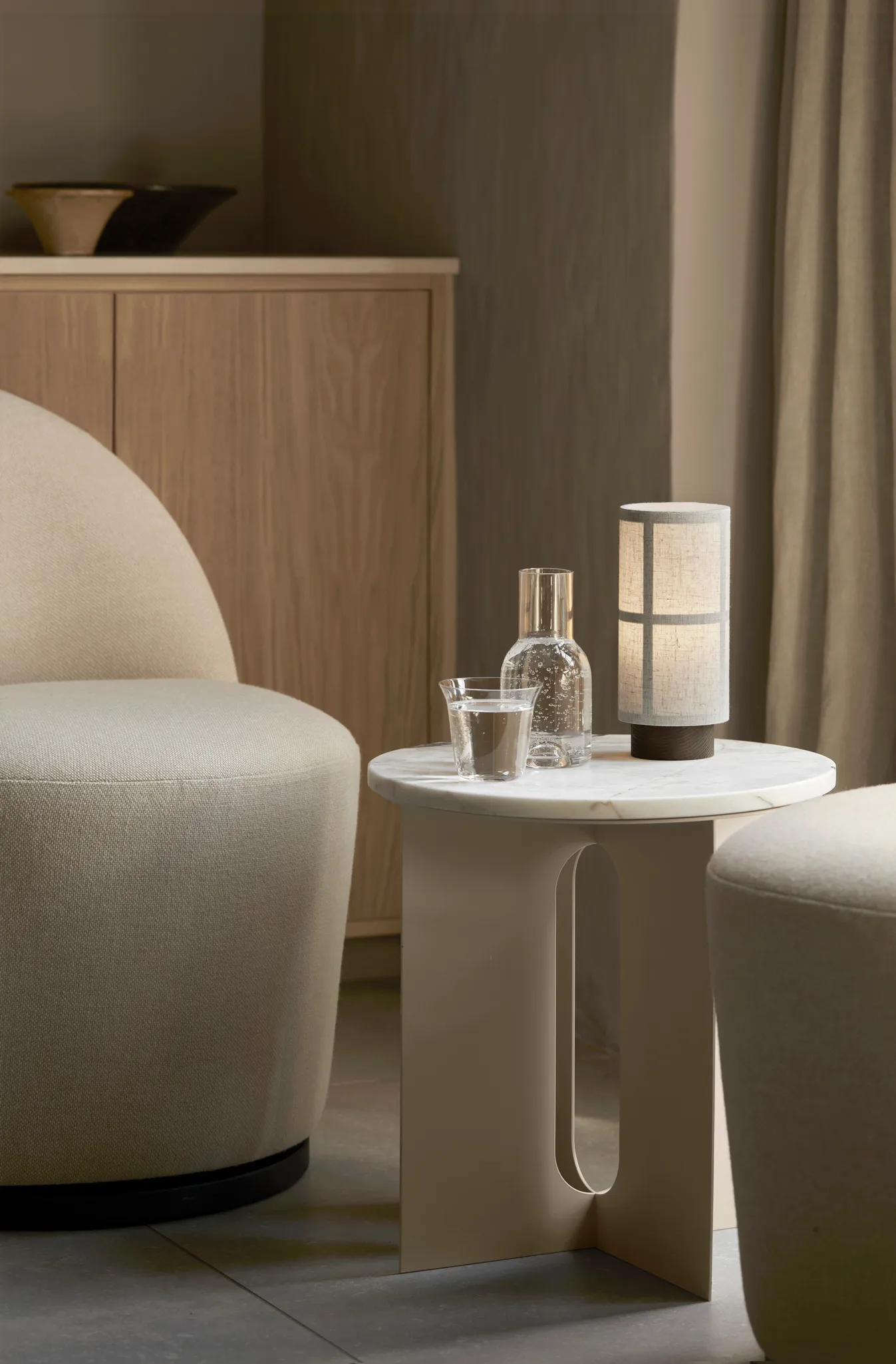 Hashira bærbar bordlampe fra Audo Copenhagen er en elegant og bærbar lampe designet af Norm Architects. Skærmen i linnedstof har en smuk form, der minder om japanske papirlanterner, og en grafisk struktur på indersiden, som træder frem effektivt, når lampen er tændt. Den bærbare design gør det let at flytte den mellem stuen, soveværelset og læsehjørnet — perfekt til stemningsfuld belysning, hvor du har brug for den. En tidløs detalje, der skaber varme og balance i hjemmet.