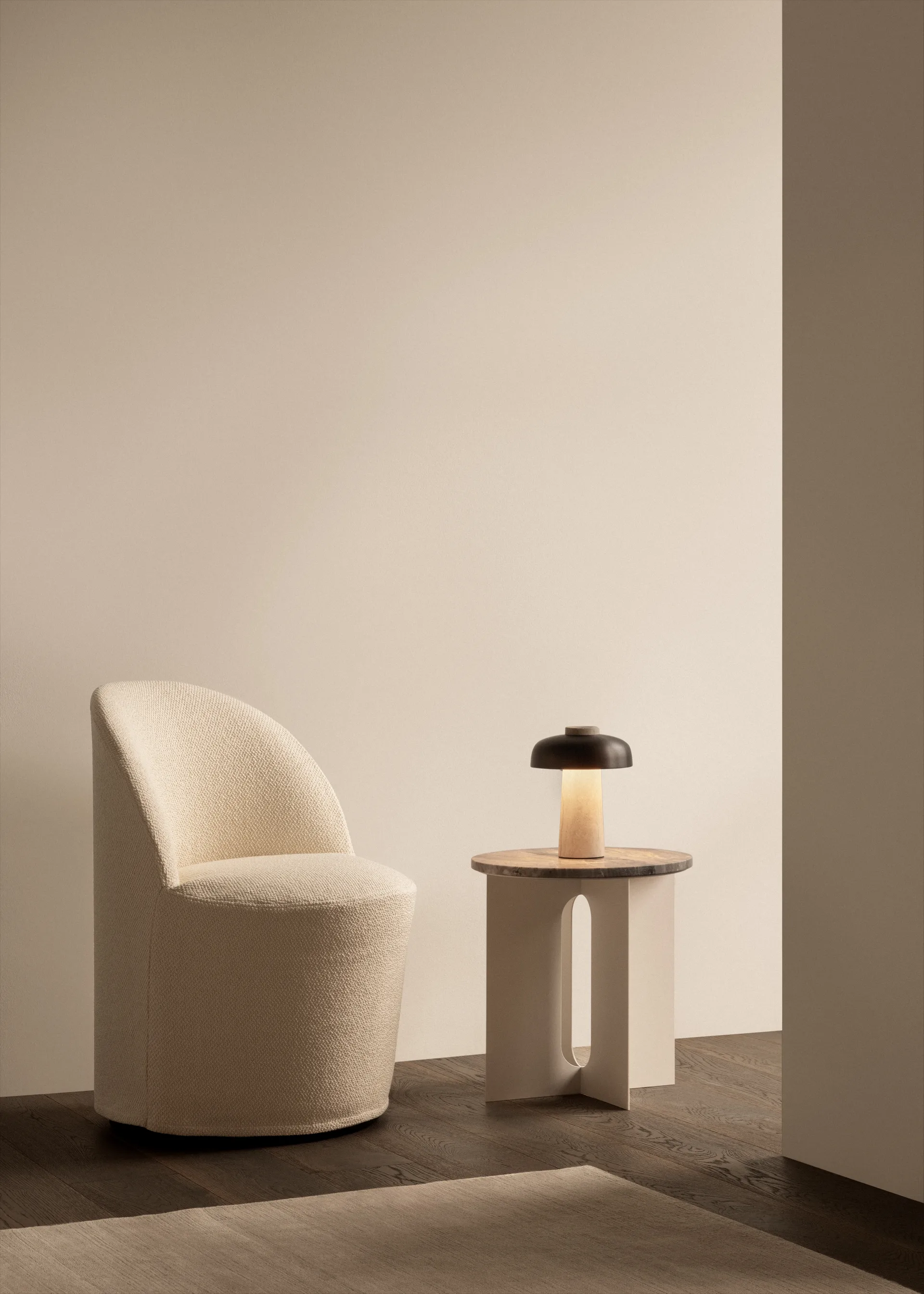 Reverse bærbar bordlampe 24,5 cm fra Audo Copenhagen forener rå og forfinede materialer i en harmonisk balance. Den koniske base i ubehandlet sten har naturlige variationer, der fremhæver dens organiske skønhed, mens den buede skærm i bronzealuminium skaber en elegant kontrast. En opal diffuser spreder et blødt og jævnt lys, som er perfekt til at skabe en stemningsfuld atmosfære. Med tre dæmpertrin tilpasser lampen sig forskellige behov og passer lige godt på sofabordet som på terrassen. En bærbar lampe, der bør opbevares indenfor, når den ikke er i brug, for øget levetid.