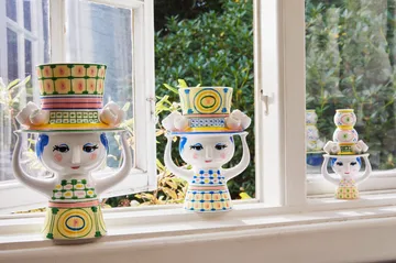 Dame med hat vase H20,5 cm fra Bjørn Wiinblad er fremstillet i keramik og prydes af håndmalede detaljer. Keramikvasen er inspireret af Wiinblads kærlighed til figurer med hatte, hvilket ses i dens legende og kreative design. Kjolens stramme linjer kontrasterer smukt mod hattens runde former. Vasen er perfekt til blomsterbuketter og bidrager til en fantasifuld indretning.
