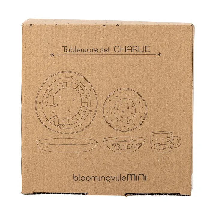 Charlie spisesæt 3 dele fra Bloomingville MINI er et legende sæt, der gør måltiderne sjovere. Sættet indeholder en kop, en skål og en tallerken, alle dekoreret med et sødt hundemotiv og bløde prikker. Fremstillet i 100 % stentøj for et slidstærkt og holdbart design. Da delene er håndmalede, kan små variationer forekomme, hvilket gør hvert sæt unikt.