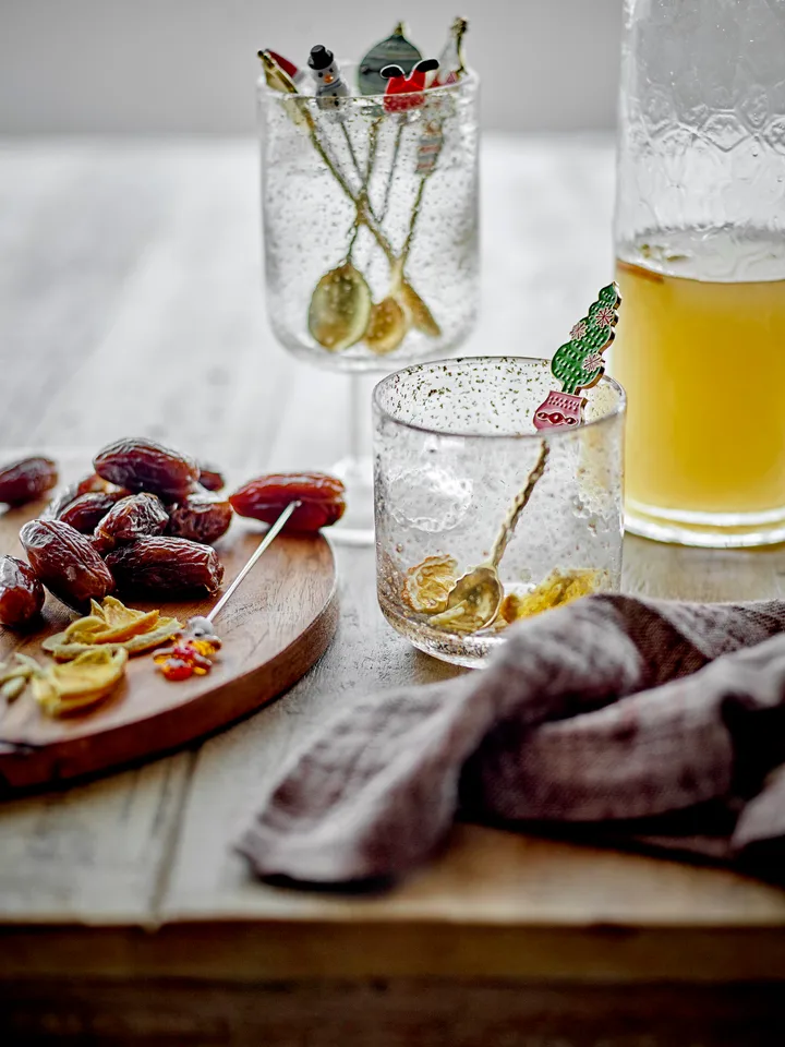 Feliz cocktail gaffel 4 dele fra Bloomingville er fremstillet af glas og er en fortryllende detalje til festlige lejligheder. Hver gaffel er pyntet med en lille juleskikkelse i glas, hvilket fanger sæsonens charme. Det mundblæste glas giver hver gaffel en unik karakter med små variationer i størrelse og form.