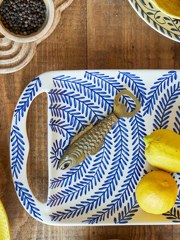 Metta flaskeåbner fra Bloomingville er en dekorativ og praktisk åbner formet som en fisk. Fremstillet af aluminium og rustfrit stål med en gylden messingfinish, tilfører den et stilfuldt touch til køkkenet eller barområdet. En perfekt kombination af funktionalitet og legende design.