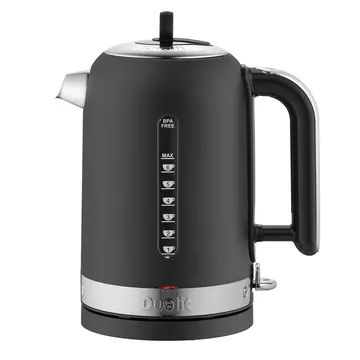 Dualit elkedel Classic 1,7 L er fremstillet af robust ABS og rustfrit stål. Denne elegante elkedel fra Dualits Classic-serie har et silikonebelagt håndtag for et sikkert greb og en drypfri tud. Med en volumen på 1,7 liter og en effekt på 3000 W er den både stille og hurtig.