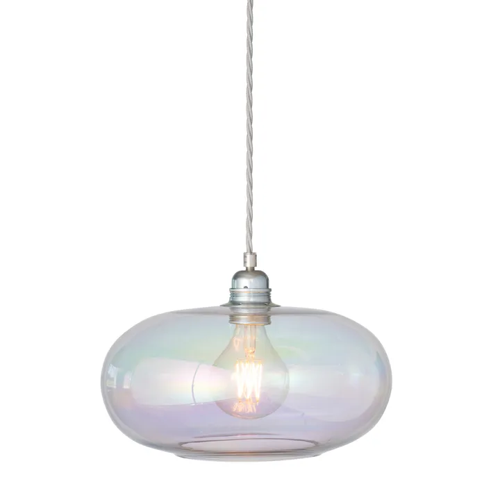 Lys spisebordet - eller stuen - op med den flotte loftslampe Horizon fra Ebb & Flow. Lampen har en oval kuppel i mundblæst glas, som sammen med den fine holder i metal og den snoede tekstilledning udgør et eksklusivt armatur. Horizon fås i flere farver og kan leveres med enten et sølvfarvet eller messingfarvet ophæng. Hvad vælger du?