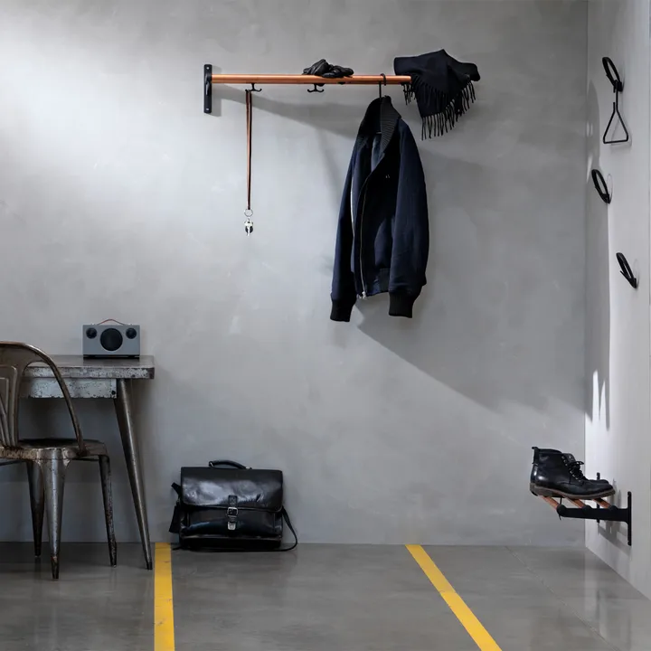 Hatte- og skohylden Nostalgi blev designet i 1937 af Gunnar Bolin. Hylden kan bruges både som skohylde og hattehylde og har vekslet i popularitet gennem årtierne, men betragtes i dag som en klassiker i svensk møbelhistorie. Konsollerne fremstilles, som dengang, af omsmeltet aluminiumsskrab, som forbindes med rundstang i træ eller aluminium. Hylden leveres med kroge, der bruges, når du vil anvende den som hattehylde. Vi anbefaler ikke at have mere end ti bøjler pr. meter hattehylde. Hylden kan forlænges med en påbygningsdel og kan således blive så lang, som man ønsker, eller helt måltilpasses ved at kappe rundstængerne til ønsket længde.