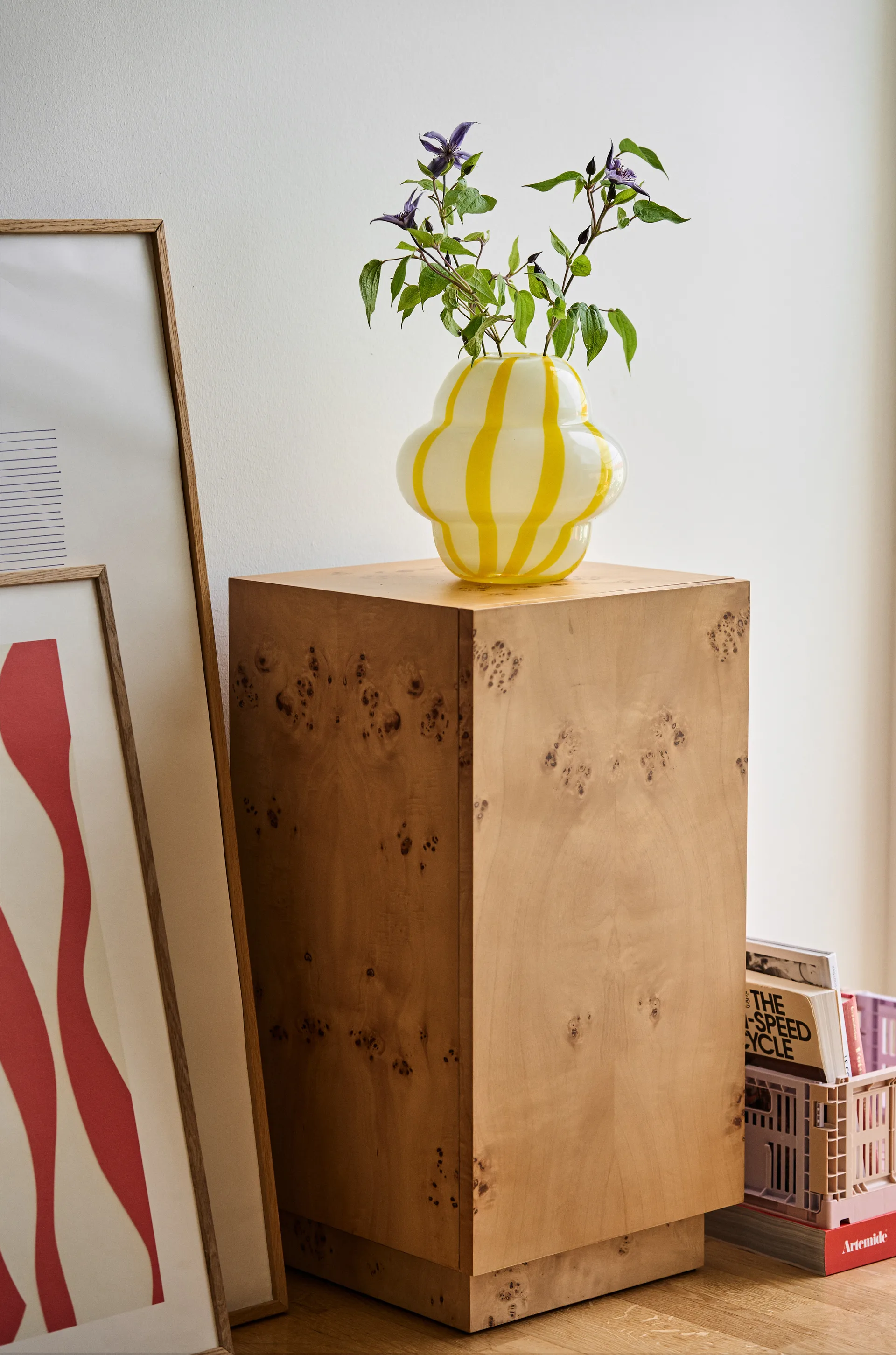 Burl Side Table piedestal fra Ferm Living er lavet af smukt mønstret, FSC™-certificeret masurbirk. Bordet er alsidigt og kan bruges både som sengebord og sidebord. Dets søjleagtige design og skjulte opbevaringsrum med justerbar hylde forstærker atmosfæren i ethvert rum.