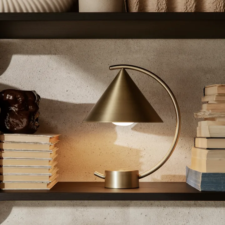 Meridian bordlampe fra Ferm Living er en bærbar, dæmpbar lampe designet af Regular Company, som forener tre enkle geometriske former til en skulpturel helhed. Den fungerer lige så godt som stemningsskaber på sidebordet som som praktisk læselampe ved yndlingslænestolen og giver op til 12 timers lys pr. opladning. Nem at flytte efter behov og let at dæmpe for den rette stemning — en smart og smuk løsning til hjemmets forskellige rum.