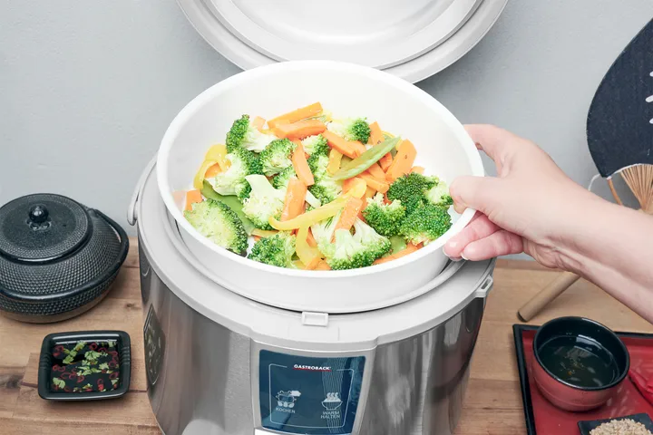 Gastroback Design 42518 riskoger pro fra Gastroback er en automatisk riskoger, som tilbereder ris uden risiko for overkogning og samtidig bevarer mineraler og vitaminer. Riskogeren er udstyret med automatisk slukning, varmeholdning og indikatorlampe. Med 5 L kapacitet og 700 W effekt samt non-stick belægning indvendigt er den perfekt til tilberedning af ris, grød, dampning af grøntsager og til at holde suppe varm.