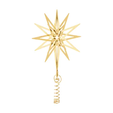 Lyra juletræsstjerne 2025 fra Georg Jensen er en gnistrende afslutning på juletræet. Fremstillet i rustfrit stål og belagt med 18 karat gult guld, sidder den sikkert med sit spiralbeslag eller kan hænges op med den medfølgende ring. Et tidløst smykke til enhver julefejring.