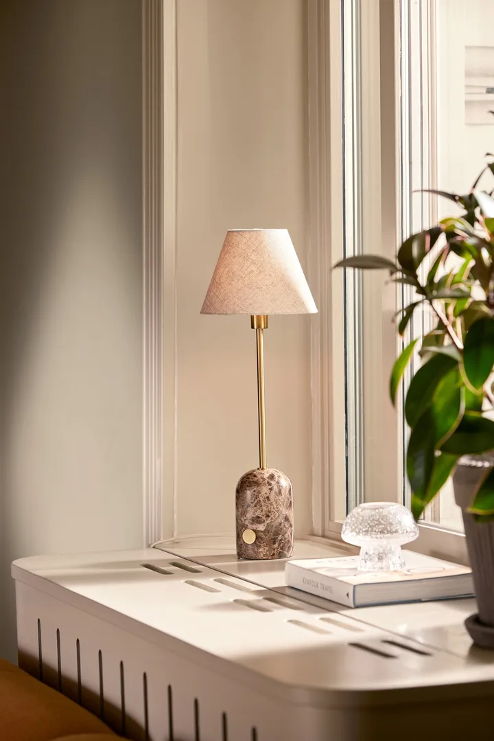 Gino 20 bordlampe fra Globen Lighting er en elegant lampe med en base af solid sten og detaljer i ægte messing. Lampeskærmen i hør giver et blødt skær. Lampen har en touchkontakt på stenbasen, der lader dig dæmpe lyset i tre trin. Designet af GL Design Studio.