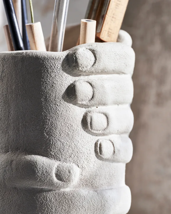Handy opbevaring til diverse redskaber fra House Doctor er en legesyg og praktisk opbevaringsskål formet som en hånd, designet i lergods. Den holder styr på småting som klemmer, tape, viskelæder og elastikker samtidig med, at den tilfører personlighed til hjemmets forskellige overflader. Placer den på skrivebordet, i køkkenet eller på kommoden for at vise dine hverdagfavoritter frem i stedet for at gemme dem i en skuffe. En smart og dekorativ løsning, der gør det nemt at finde det, du har brug for.