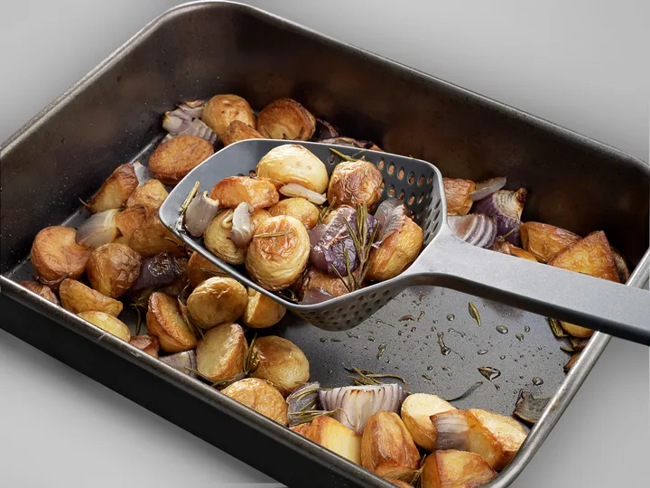 Scoop plus dørslag 34 cm fra Joseph Joseph er et praktisk køkkenredskab, der lader dig øse, lade væsken løbe fra og servere direkte fra en varm pande eller bradepande. Med silikonehåndtag og små kroge på undersiden kan du nemt hvile det på pandens eller grydekanstens kant under afdrypning.