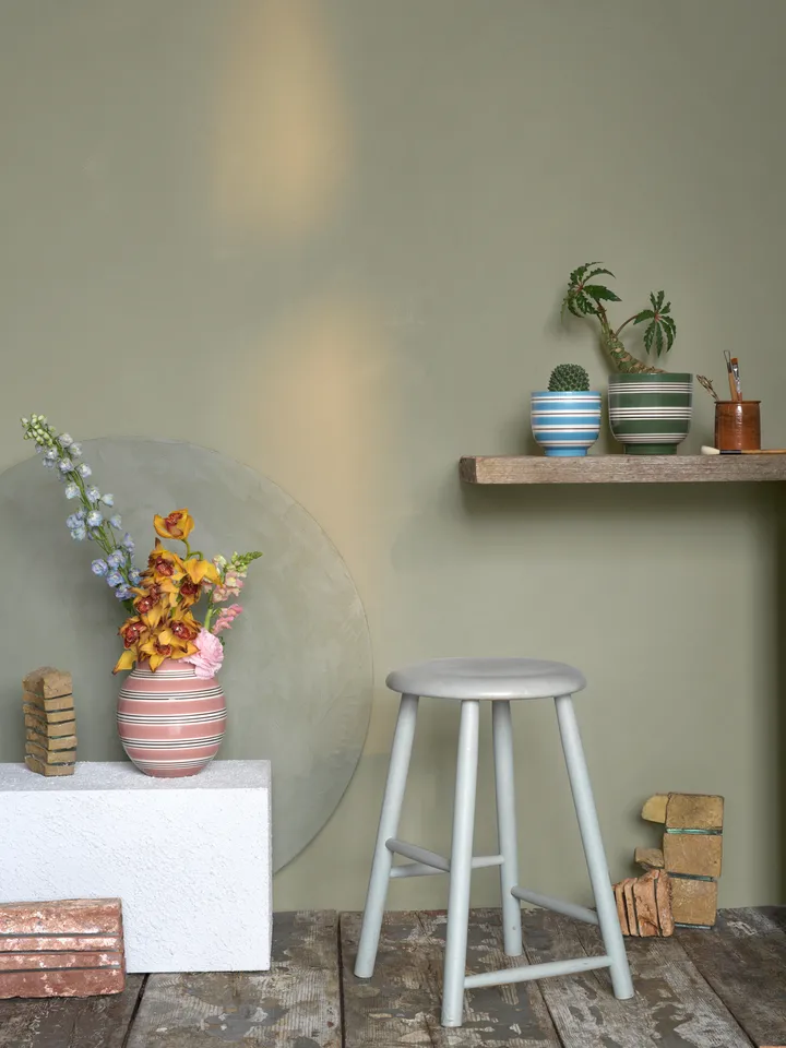 Omaggio Nuovo blomsterkrukke Ø12 cm fra Kähler er en håndmalet krukke fra den legesyge Omaggio-kollektion. Med sine livfulde striber bliver den en glad detalje i vindueskarmen eller på sidebordet, perfekt til små planter og krydderurter. Den omhyggelige maling giver hvert eksemplar personlighed, samtidig med at formen er tidløs og nem at kombinere med andre krukker i hjemmet. En enkel og farverig opgradering, der gør grønne planter endnu mere hyggelige.
