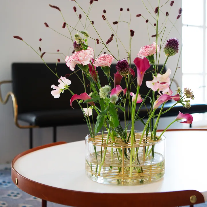Äng vase, stor fra KLONG er en elegant vase fra Äng-kollektionen designet af Eva Schildt. Den håndlavede metalramme fungerer som en indbygget blomstestøtte og giver dine snitblomster stabilitet og smuk struktur. Hver vase får et unikt udtryk, da mønsteret er fremstillet i hånden, hvilket gør hvert eksemplar særligt charmerende. Messingen er lakeret for at tåle vand — rengør grundigt for plantesaft og skift blomstvandet ofte for at bevare finishen. Perfekt for den, der vil løfte blomsterne til en varm, skandinavisk detalje i hjemmet.
