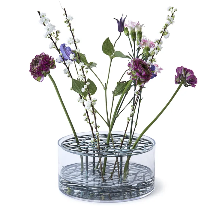 Äng vase, stor fra KLONG er en elegant vase fra Äng-kollektionen designet af Eva Schildt. Den håndlavede metalramme fungerer som en indbygget blomstestøtte og giver dine snitblomster stabilitet og smuk struktur. Hver vase får et unikt udtryk, da mønsteret er fremstillet i hånden, hvilket gør hvert eksemplar særligt charmerende. Messingen er lakeret for at tåle vand — rengør grundigt for plantesaft og skift blomstvandet ofte for at bevare finishen. Perfekt for den, der vil løfte blomsterne til en varm, skandinavisk detalje i hjemmet.