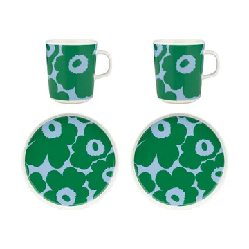 Unikko morgenmadssæt fra finske Marimekko består af to krus og to underkopper i stentøj med det berømte Unikko-mønster designet af Maija Isola i 1960'erne. Formerne på krusene og underkopperne er udviklet af Sami Ruotsalainen. Det blomstrede sæt passer lige godt til hyggen med vennerne som til morgenmaden med familien.