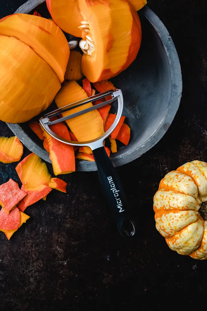 Professionel XL-skræller 17 cm fra Microplane er uundværlig i køkkenet. Det ultraskarpe blad i rustfrit stål skærer nemt større frugter og rodfrugter med tykt skal som græskar og melon. Med det komfortable, ergonomiske håndtag passer den både til venstre- og højrehåndede brugere og tilbyder nem håndtering for sikker brug. Den let tungere konstruktion og bredere blad gør skrælningen nemmere. Opbevar skrælleren nemt ved at hænge den op eller lægge den i en skuffe.