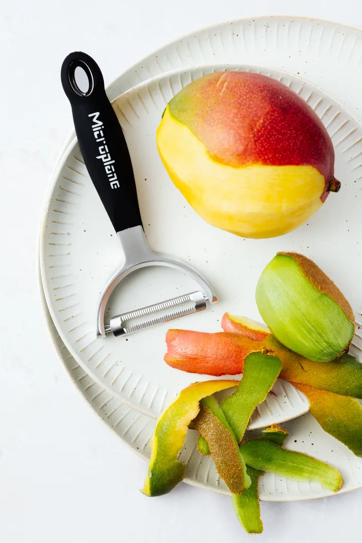 Professionel Y-skræller tandet 16,4 cm. Professional Y-skræller tandet fra Microplane Speciality tilbyder effektiv skrælning af frugt og grøntsager. Udstyret med barberbladsskarpe rustfri stålklinger glider den let over overfladen. Y-formen garanterer komfortabel og kontrolleret skrælning. Perfekt til både professionelle kokke og madlavningsentusiaster, gør denne tandede skræller skrælningen hurtig og nem. Designet til at lette og fremskynde dine daglige opgaver i køkkenet. En uundværlig køkkenassistent, der tilbyder både funktionalitet og præcision i hvert træk. Let at bruge og imponerende i resultat.