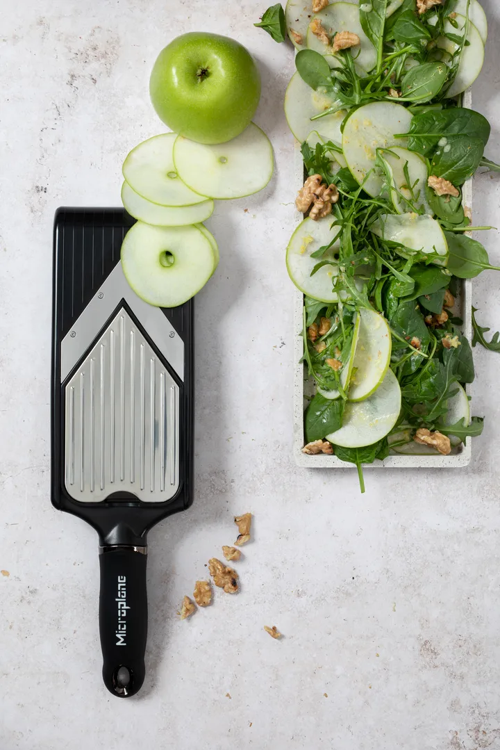 Speciality V-Slicer grøntsagsskærer julienne blade fra Microplane er et alsidigt køkkenredskab fra Speciality-kollektionen. Med justerbart V-blad og julienne-funktion kan du nemt tilpasse skivetykkelsen med Infinity Dial. Det holdbare rustfri stål skærer effektivt grøntsager, frugt og ost i jævne skiver og strimler uden at rive. Den skridsikre fod og skåleanker giver stabilitet, mens det medfølgende universelle håndbeskyttelse sikrer sikkerheden. Perfekt til salater, coleslaw, poke bowls og mere.