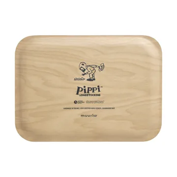Pippi bakke 20x27 cm fra Muurla forener stil og funktion. Fremstillet af birkefiner med en mat lamineret overflade, er den både holdbar og charmerende. Håndlavet og prydet med illustrationer på begge sider, og tåler opvaskemaskine for nem rengøring. En del af Pippi Langstrømpe-kollektionen, som er perfekt til alle lejligheder, både til hverdag og fest.