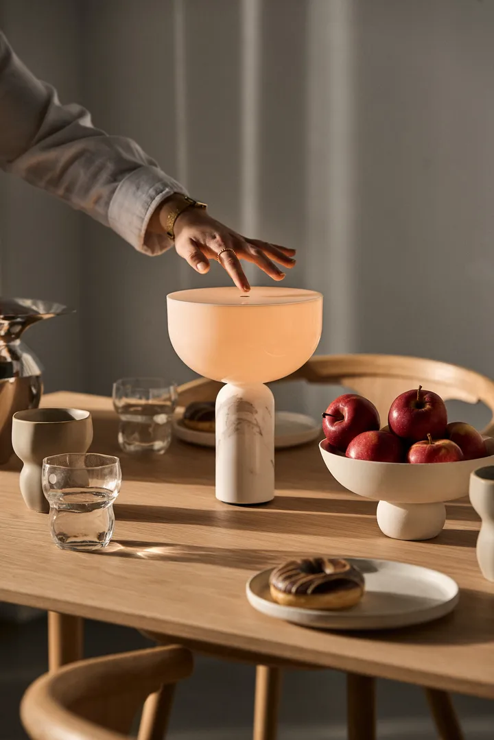 Kizu bærbar bordlampe fra New Works er en bærbar lampe designet af Lars Tornøe, der fanger blikket med sin skulpturelle sammensætning. Den portable version er let at flytte hen, hvor lyset behøves, og har en stabil fornemmelse takket være marmorelementet, som føles varmt og behageligt i hånden. En snoet nedsænket metalring øverst fungerer som en tretrinsdæmper til enkel stemningsstyring. Op til 10 timers batteritid på højeste lysniveau og nem opladning via USB‑C gør Kizu bærbar bordlampe perfekt til aftener i stuen, på altanen eller som stemningsfuld læselampe.