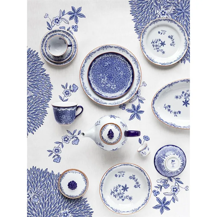 Dæk bordet med det ovale serveringsfad fra Ostindia. Ostindia blev presenteret allerede i 1930´erne og stellet er stadig ét af Rörstrands bedst sælgende stel. Ostindia serien består af krus, kopper, skåle, asietter og tallerkener og gennem årene har forskellige designere sat deres præg, bland andet Knut Almström som oprindelig designede Ostindia, men også Caroline Slotte og Anna Lerinder, der har fornyet den klassiske serie og givet det tillægsnavnet Floris.