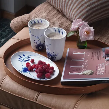 Varm dig selv med en varm kop te eller kaffe i termokoppen fra Royal Copenhagen. Det koboltblå mønster blev designet af Karen Kjældgård-Larsen i 2000, da hun var en ung designstuderende. I Danmark betragter vi det musselmalede stel som en del af vores kulturarv og ofte står det i mange hjem hvor det er gået i arv fra generation til generation.