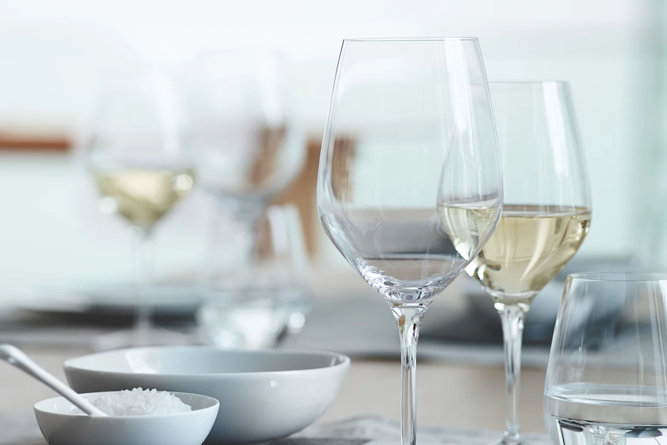 Fordi hvidvin serveres ved en lavere temperatur end rødvin, har hvidvinsglas tendens til at være lidt mindre end rødvinsglas, så vinen ikke bliver varm så hurtigt. Champagneglas er også en del af Spiegelaus sortiment og har en elegant, smal form, hvilket sikrer, at champagnen holder sig frisk og sprudlende i lang tid.
