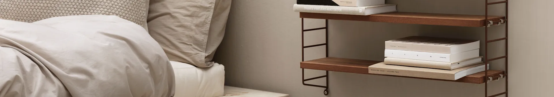 For at skabe et komfortabelt soveværelse til afslapning er gode opbevaringsmuligheder vigtige. En bogreol fra String kan kombineres i uendelige størrelser, farver og finish. Hylden kan være vægmonteret eller placeret på gulvet og kan suppleres med hyldeplader, skabe og magasinhylder. Her kan du placere bøger, dekorativ belysning og dine yndlingsgenstande for at skabe et hyggeligt og indbydende miljø.